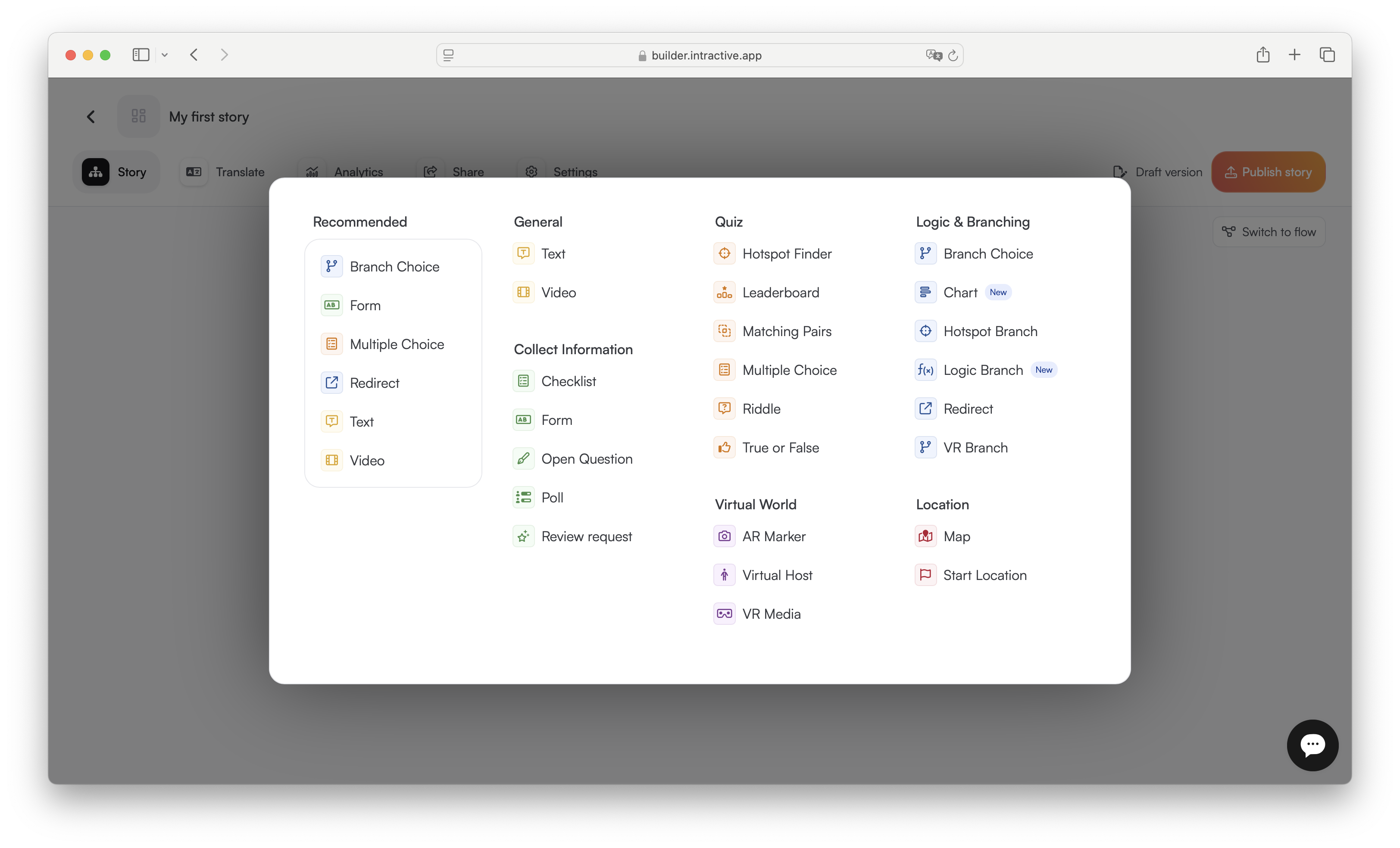 Logic & Branching: Advanced interactive blocks that personalize the user experience through choices, logic, and branching, such as Branch Choice, Logic Branch, Hotspot Branch, and VR Branch.