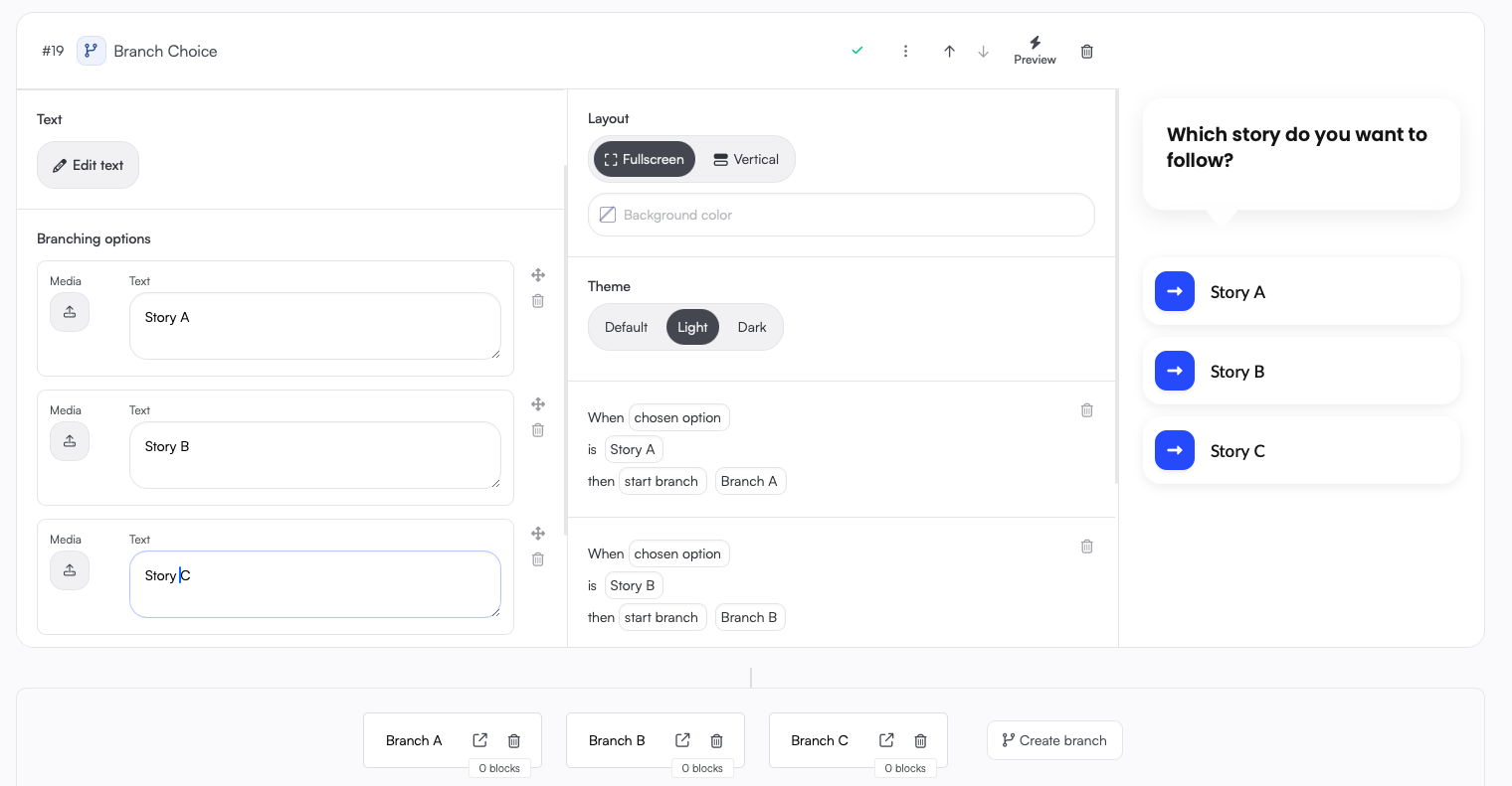 Open the Story editor of your story and add a Branch Choice content block: